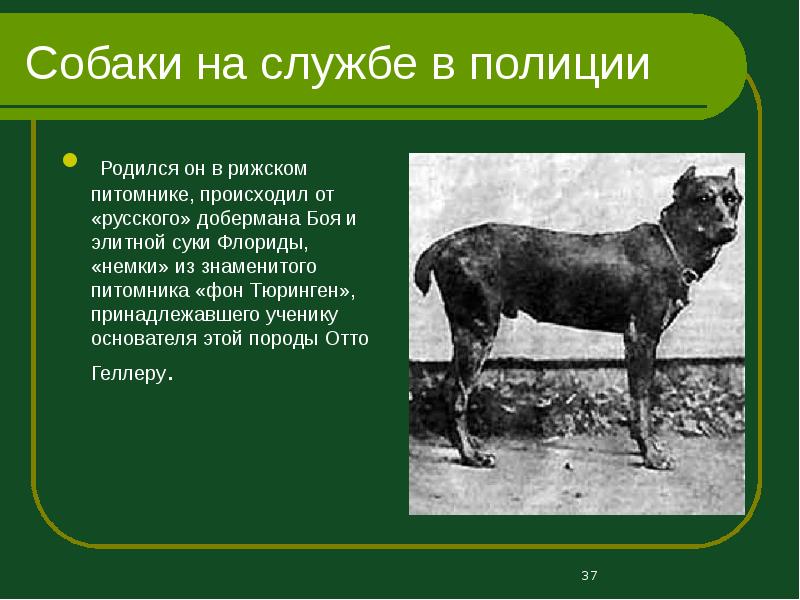 - 37. Собаки на службе в полиции Родился он в рижском питомнике, происходил