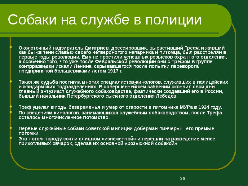 - 38. Собаки на службе в полиции Околоточный надзиратель Дмитриев, дрессировщик, вырастивший Трефа