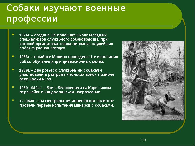 - 39. Собаки изучают военные профессии 1924г. – создана Центральная школа младших