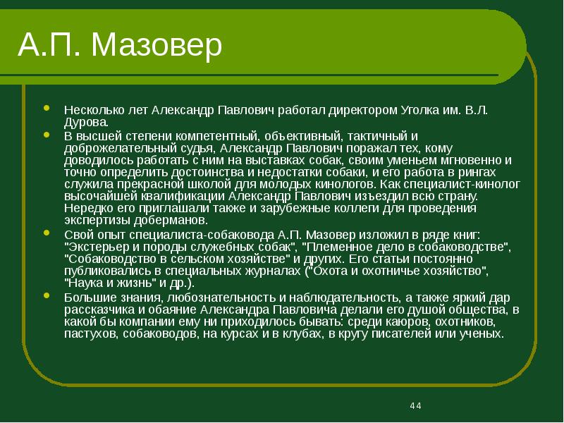 - 44. А.П. Мазовер Несколько лет Александр Павлович работал директором Уголка им. В.Л.