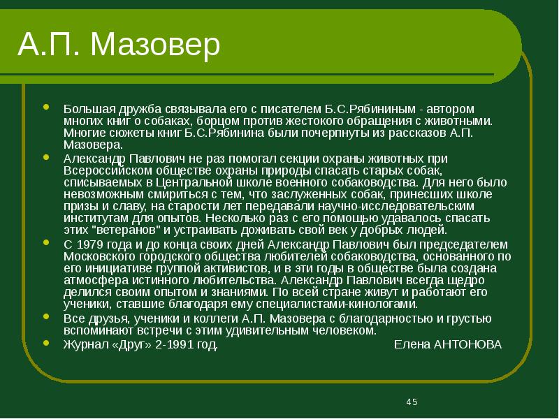 - 45. А.П. Мазовер Большая дружба связывала его с писателем Б.С.Рябининым - автором