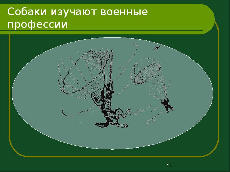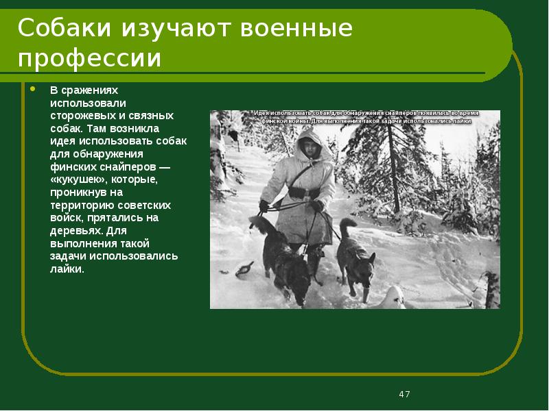 - 47. Собаки изучают военные профессии В сражениях использовали сторожевых и связных собак.