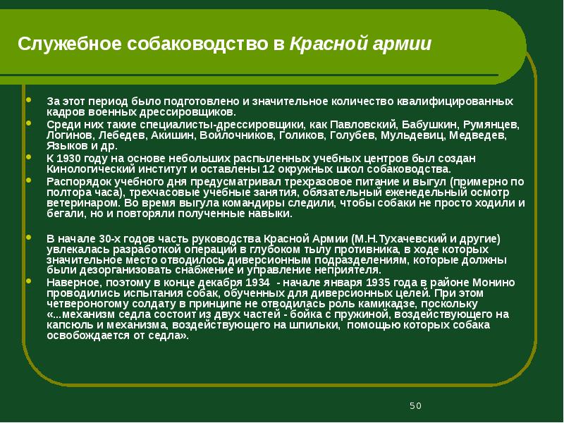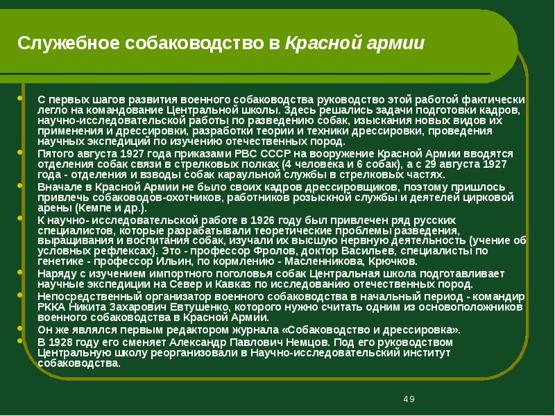 - 49. Служебное собаководство в Красной армии С первых шагов развития военного собаководства