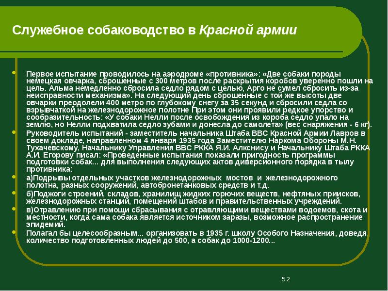 - 52. Служебное собаководство в Красной армии Первое испытание проводилось на аэродроме