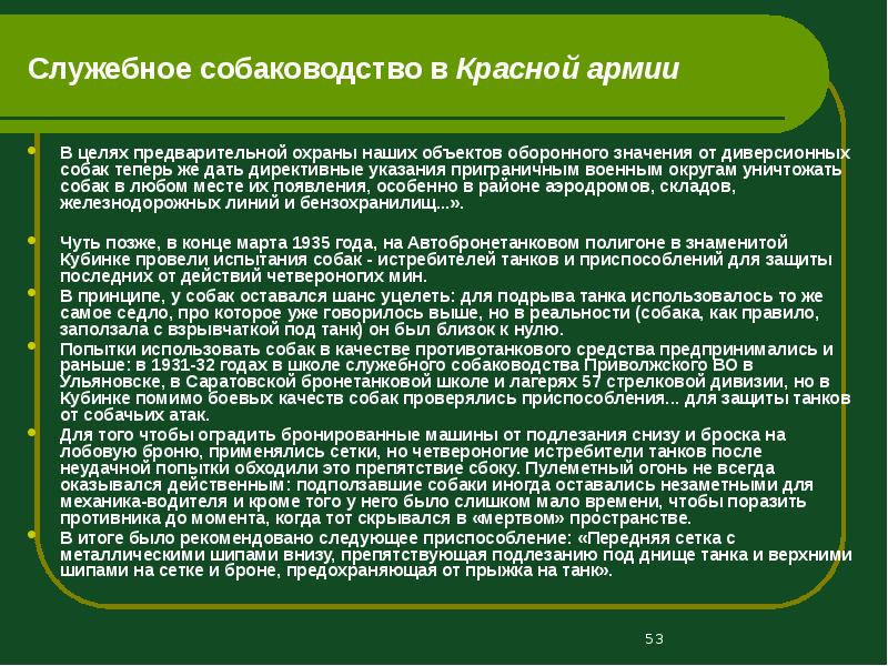 - 53. Служебное собаководство в Красной армии В целях предварительной охраны наших объектов