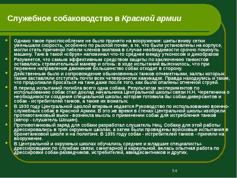 - 54. Служебное собаководство в Красной армии Однако такое приспособление не было принято