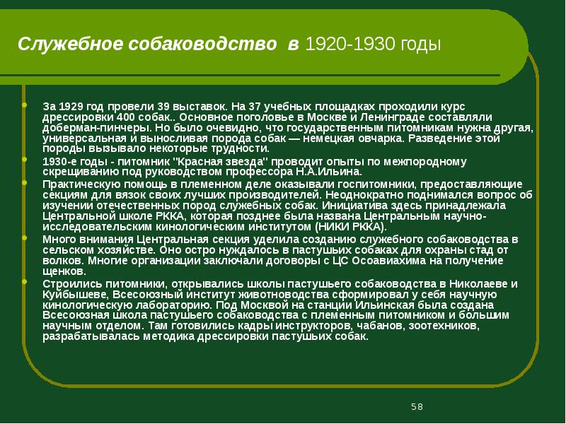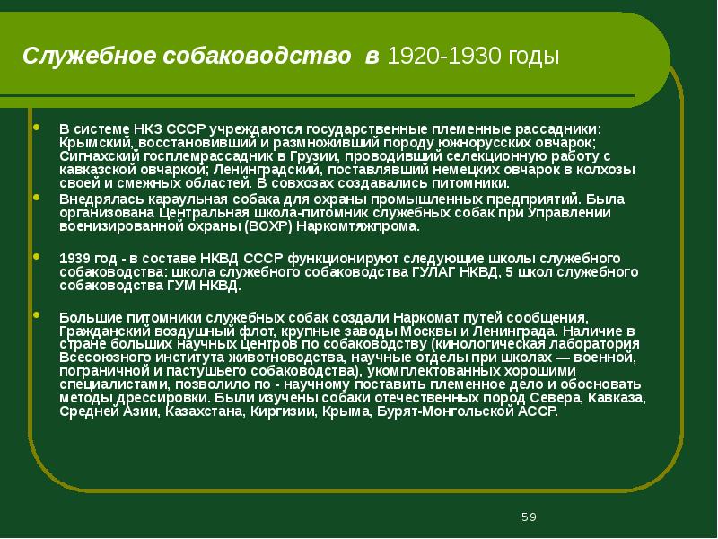 - 59. Служебное собаководство в 1920-1930 годы В системе НКЗ СССР учреждаются государственные