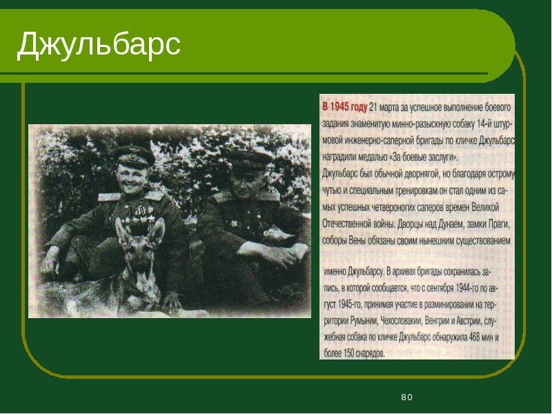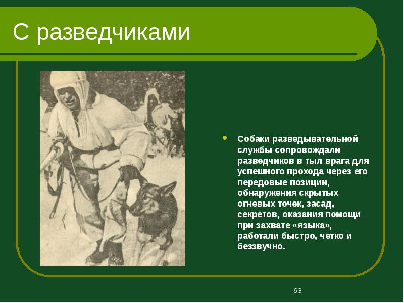 - 63. С разведчиками Собаки разведывательной службы сопровождали разведчиков в тыл врага для