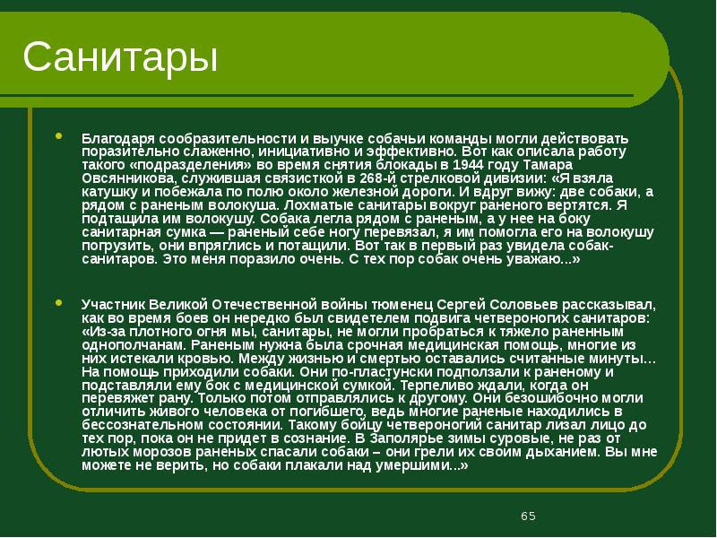 - 65. Санитары Благодаря сообразительности и выучке собачьи команды могли действовать поразительно слаженно,