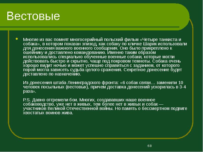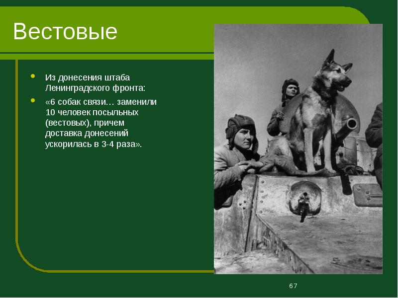 - 67. Вестовые Из донесения штаба Ленинградского фронта: «6 собак связи… заменили