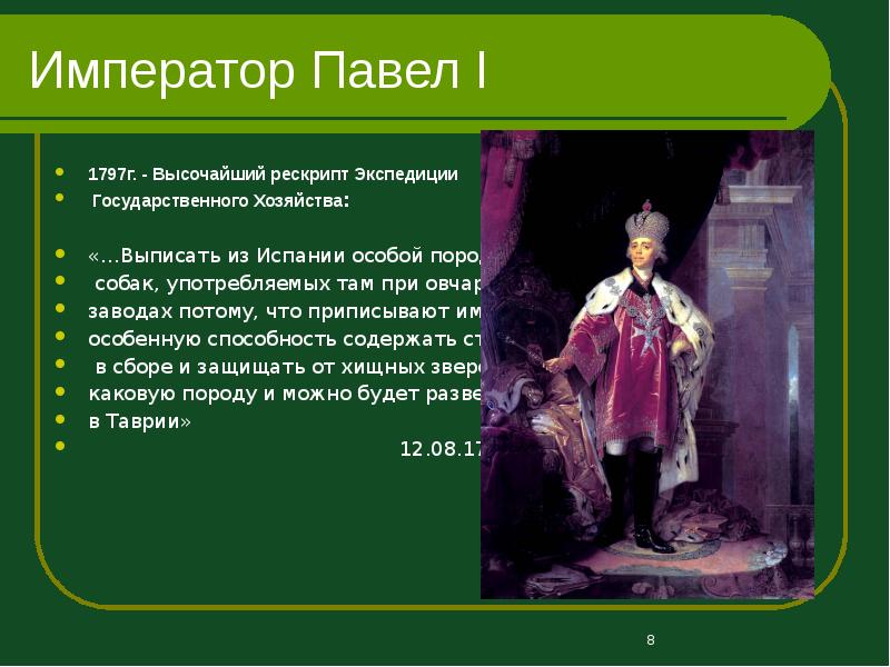 - 8. Император Павел I 1797г. - Высочайший рескрипт Экспедиции Государственного Хозяйства: «…Выписать
