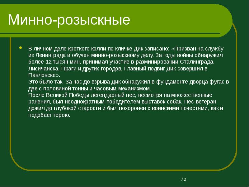 - 72. Минно-розыскные В личном деле кроткого колли по кличке Дик записано: «Призван