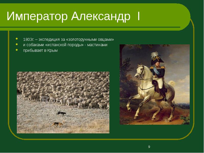 - 9. Император Александр I 1803г. – экспедиция за «золоторунными овцами» и собаками