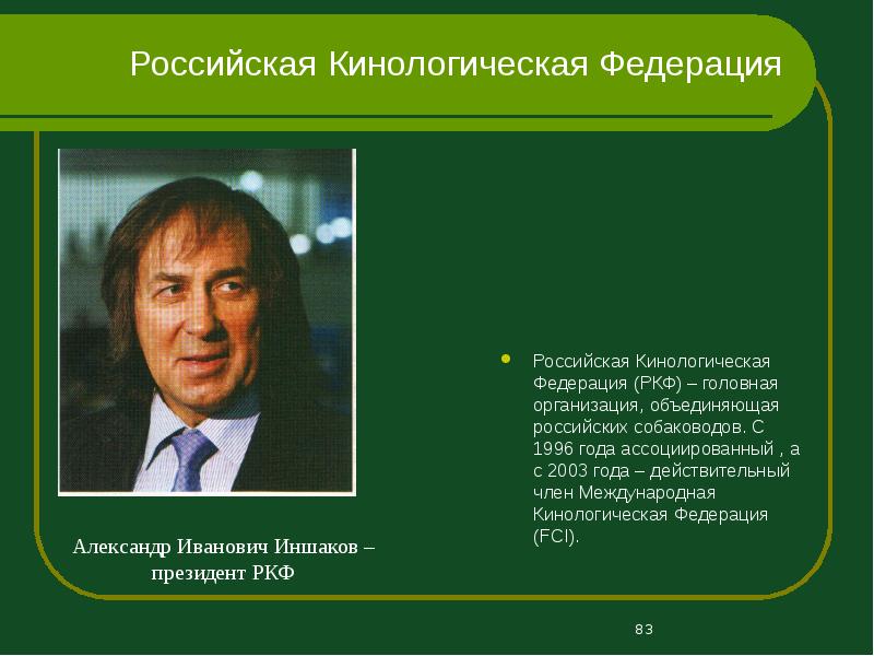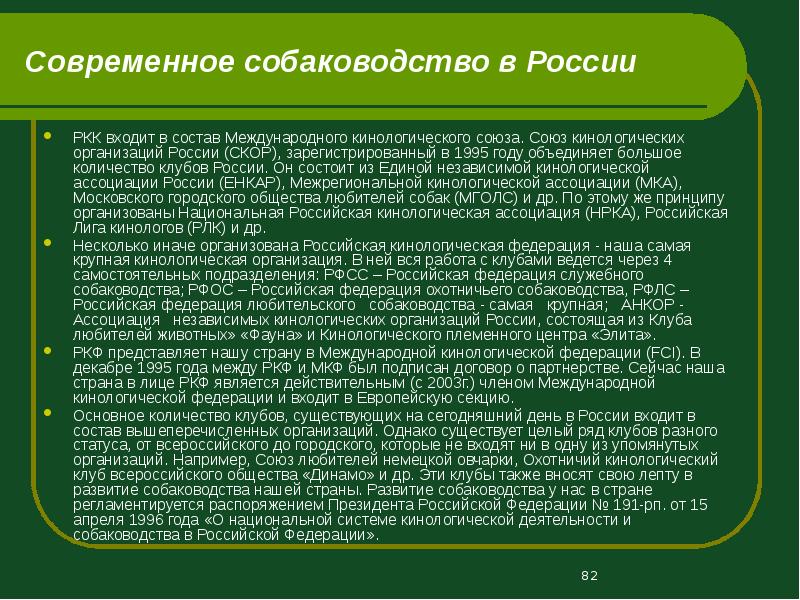 - 82. Современное собаководство в России РКК входит в состав Международного кинологического союза.