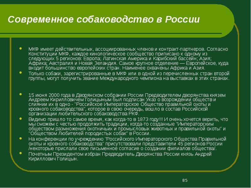 - 85. Современное собаководство в России МКФ имеет действительных, ассоциированных членов и контракт-партнеров.