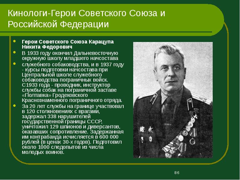 - 86. Кинологи-Герои Советского Союза и Российской Федерации Герои Советского Союза Карацупа Никита