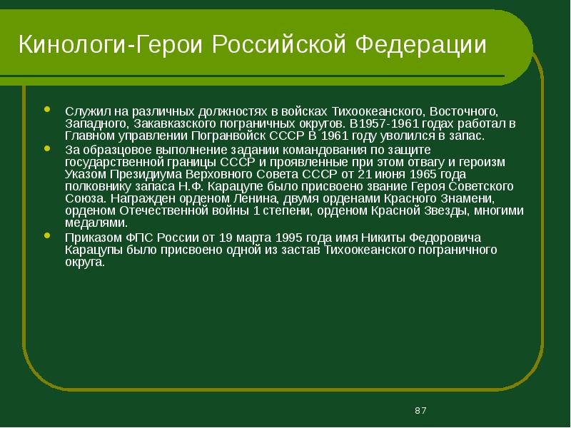 - 87. Кинологи-Герои Российской Федерации Служил на различных должностях в войсках Тихоокеанского, Восточного,