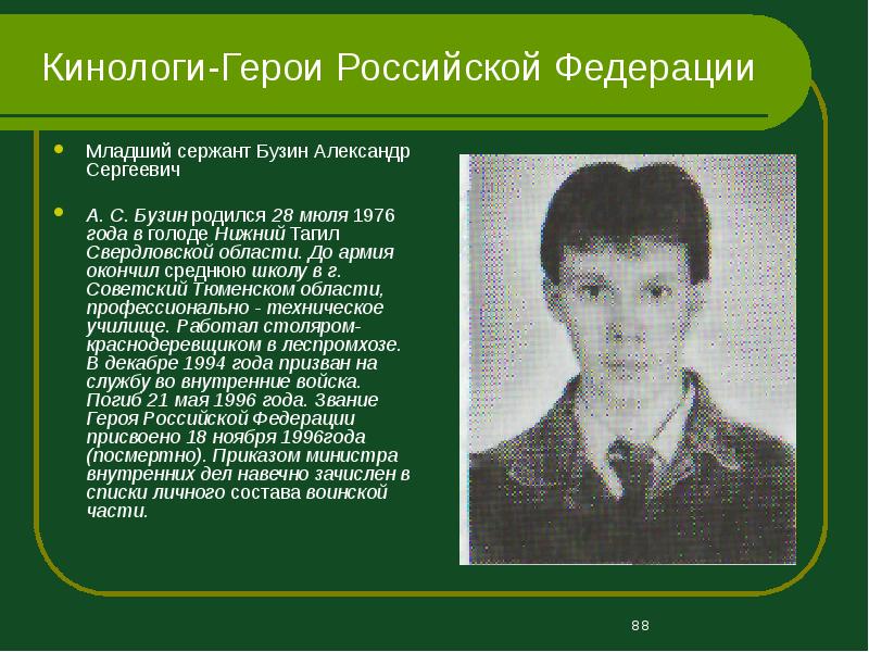 - 88. Кинологи-Герои Российской Федерации Младший сержант Бузин Александр Сергеевич А. С.
