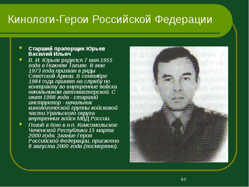 - 90. Кинологи-Герои Российской Федерации Старший прапорщик Юрьев Василий Ильич В. И. Юрьев