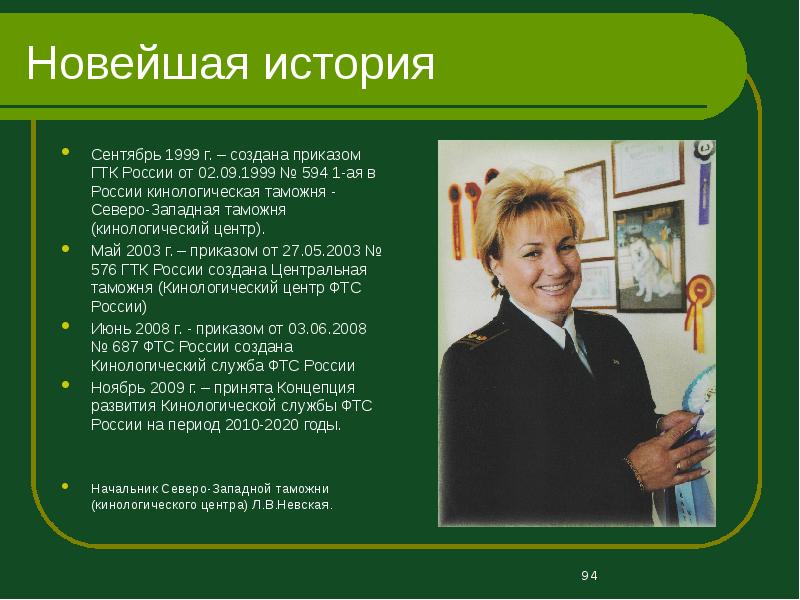 - 94. Новейшая история Сентябрь 1999 г. – создана приказом ГТК России от