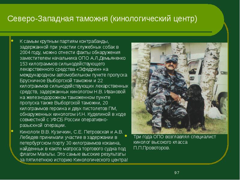 - 97. Северо-Западная таможня (кинологический центр) К самым крупным партиям контрабанды, задержанной при