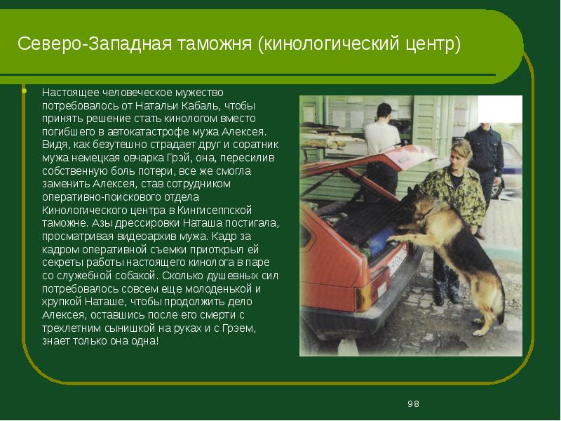 - 98. Северо-Западная таможня (кинологический центр) Настоящее человеческое мужество потребовалось от Натальи Кабаль,