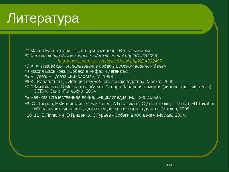 - 100. Литература *1 Мария Барыкова «Псы-рыцари и минеры. Всё о собаках» *2