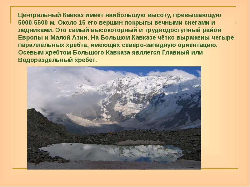 - 2. Горы Большого Кавказа расположились между Чёрным и Каспийским морями, от Таманского