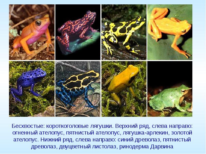 - 20. Бесхвостые. Верхний ряд, слева направо: квакши (обыкновенная квакша, двуцветная филломедуза), чесночницевые