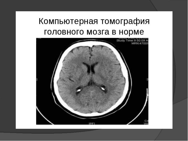 - 15. На КТ головного мозга на границе лобной и теменной доли слева
