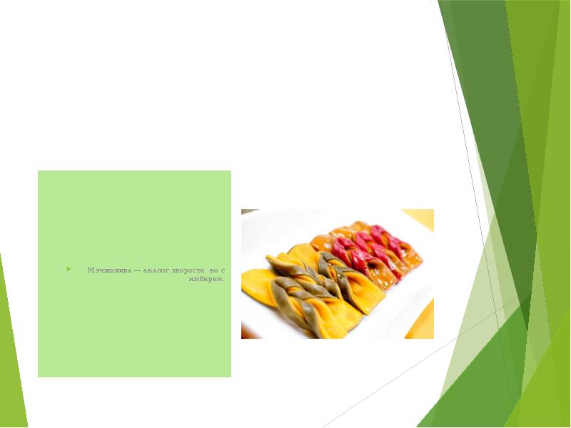 - 6. Кимчхи́ — блюдо корейской кухни, представляющее собой остро приправленные квашеные (ферментированные) овощи, в первую очередь, пекинскую