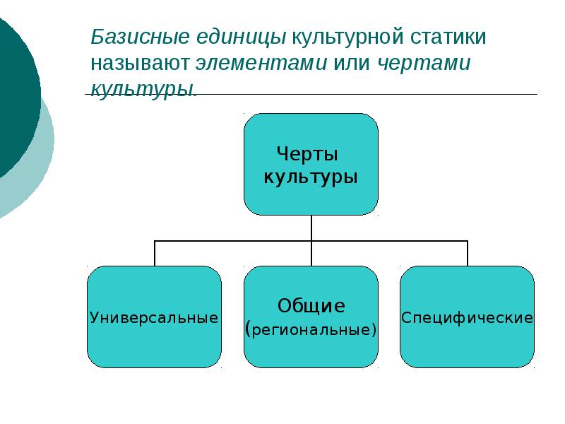 - 6. Базисные единицы культурной статики называют элементами или чертами культуры.