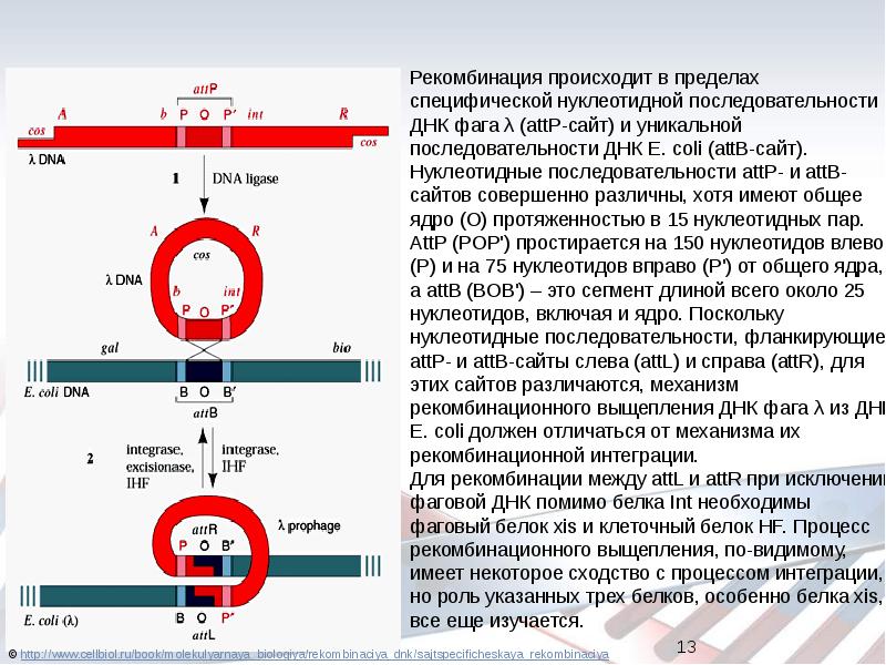 - 12. Сайт-специфическая рекомбинация бактериофага λ Происходит между специфическими сегментами дуплексов ДНК,