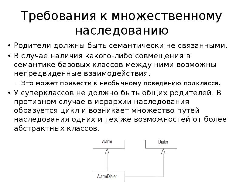При множественном наследовании у класса может быть более одногоТребования к множественному наследованию