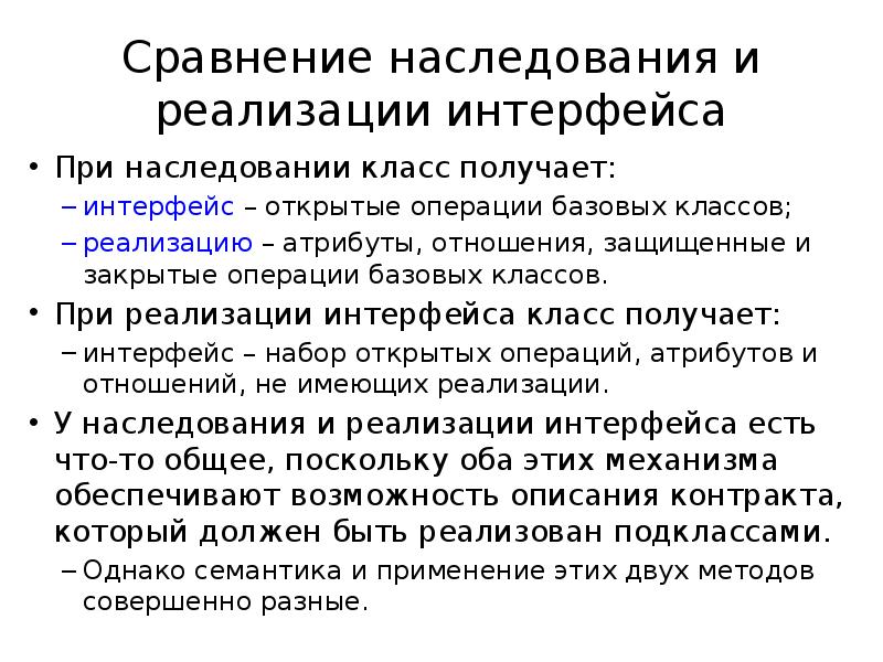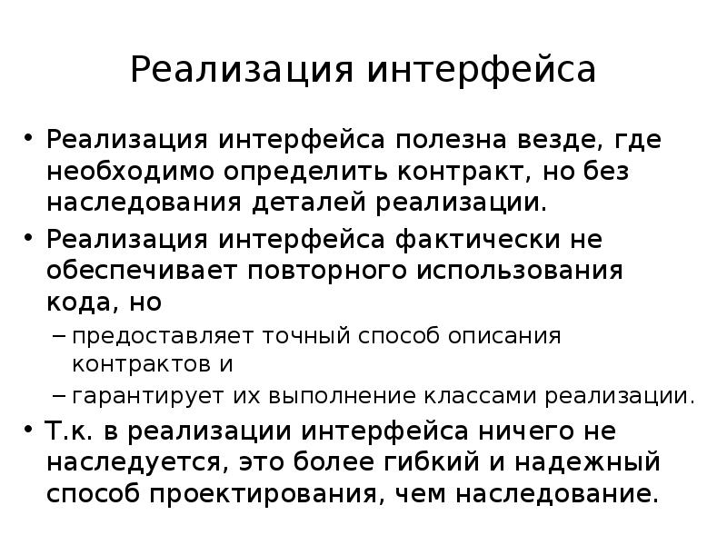 В начале использования ОО подхода наследование часто считали основным механизмомРеализация интерфейса