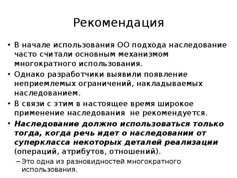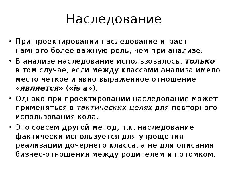 Наследование При проектировании наследование играет намного более важную роль, чем при анализе. В анализе наследование использовалось, только в том случае, если между классами анализа имело место четкое и явно выраженное отношение «является» («is a»). Однако при проектировании наследование может применяться в тактических целях для повторного использования кода. Это совсем другой метод, т.к. наследование фактически используется для упрощения реализации дочернего класса, а не для описания бизнес-отношения между родителем и потомком.