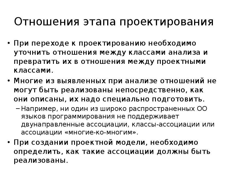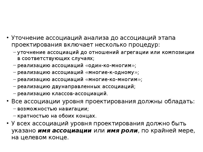 При переходе к проектированию необходимо уточнить отношения междуУточнение ассоциаций анализа до ассоциаций этапа проектирования включает несколько процедур: