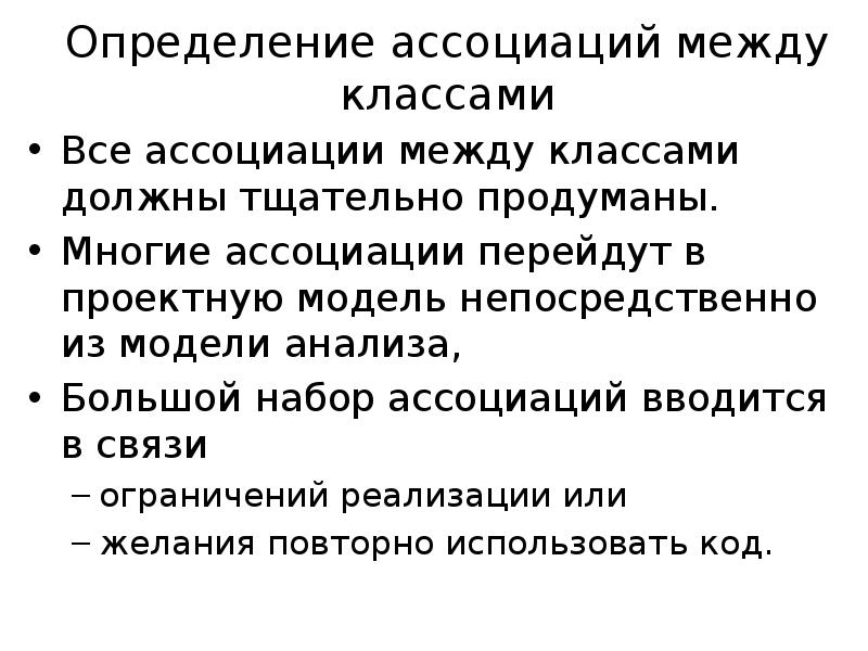 Определение ассоциаций между классами Все ассоциации между классами должны тщательно продуманы. Многие ассоциации перейдут в проектную модель непосредственно из модели анализа, Большой набор ассоциаций вводится в связи ограничений реализации или желания повторно использовать код.