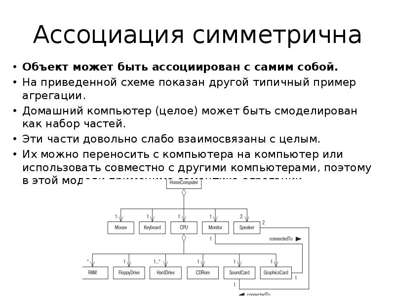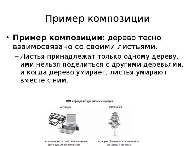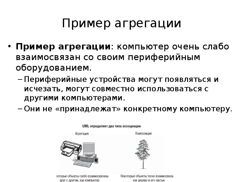 Пример агрегации: компьютер очень слабо взаимосвязан со своим периферийнымПример композиции