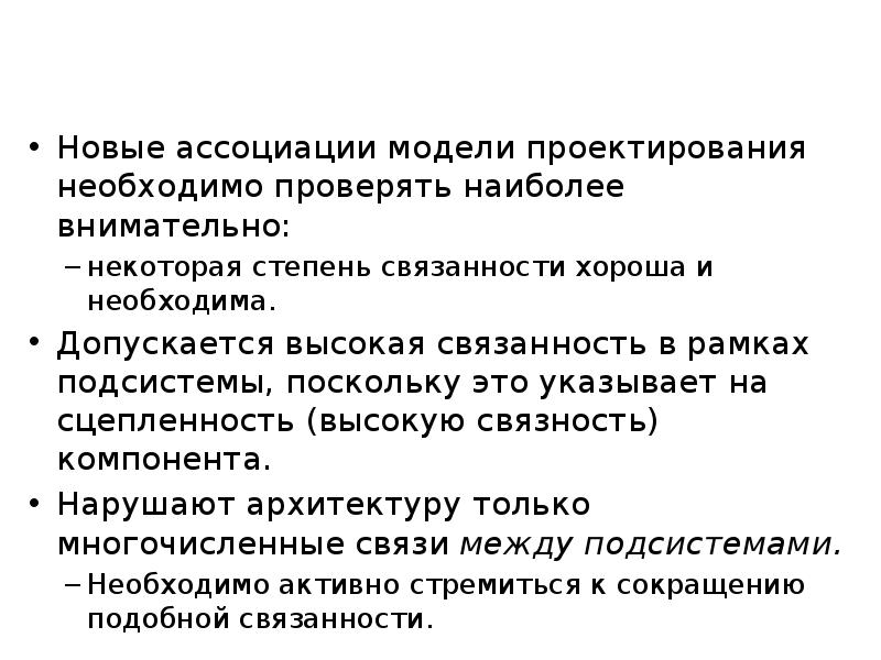 Новые ассоциации модели проектирования необходимо проверять наиболее внимательно: некоторая степень связанности хороша и необходима. Допускается высокая связанность в рамках подсистемы, поскольку это указывает на сцепленность (высокую связность) компонента. Нарушают архитектуру только многочисленные связи между подсистемами. Необходимо активно стремиться к сокращению подобной связанности.