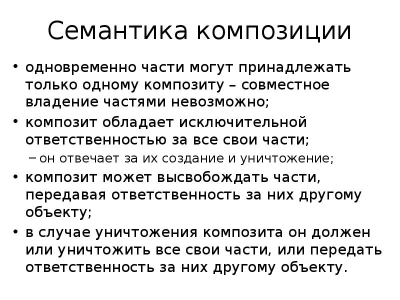 Семантика композиции одновременно части могут принадлежать только одному композиту – совместное владение частями невозможно; композит обладает исключительной ответственностью за все свои части; он отвечает за их создание и уничтожение; композит может высвобождать части, передавая ответственность за них другому объекту; в случае уничтожения композита он должен или уничтожить все свои части, или передать ответственность за них другому объекту.