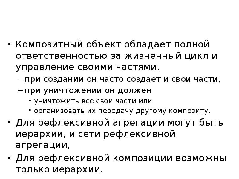 Композитный объект обладает полной ответственностью за жизненный цикл и управление своими частями. при создании он часто создает и свои части; при уничтожении он должен уничтожить все свои части или организовать их передачу другому композиту. Для рефлексивной агрегации могут быть иерархии, и сети рефлексивной агрегации, Для рефлексивной композиции возможны только иерархии.