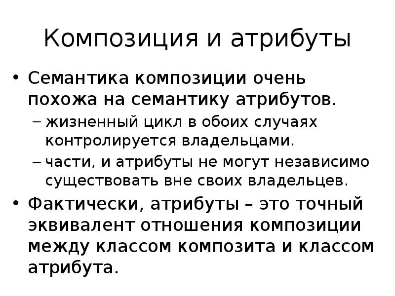 Композиция и атрибуты Семантика композиции очень похожа на семантику атрибутов. жизненный цикл в обоих случаях контролируется владельцами. части, и атрибуты не могут независимо существовать вне своих владельцев. Фактически, атрибуты – это точный эквивалент отношения композиции между классом композита и классом атрибута.