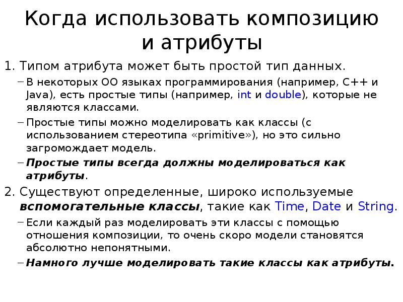 Когда использовать композицию и атрибуты Типом атрибута может быть простой тип данных. В некоторых ОО языках программирования (например, C++ и Java), есть простые типы (например, int и double), которые не являются классами. Простые типы можно моделировать как классы (с использованием стереотипа «primitive»), но это сильно загромождает модель. Простые типы всегда должны моделироваться как атрибуты. Существуют определенные, широко используемые вспомогательные классы, такие как Time, Date и String. Если каждый раз моделировать эти классы с помощью отношения композиции, то очень скоро модели становятся абсолютно непонятными. Намного лучше моделировать такие классы как атрибуты.
