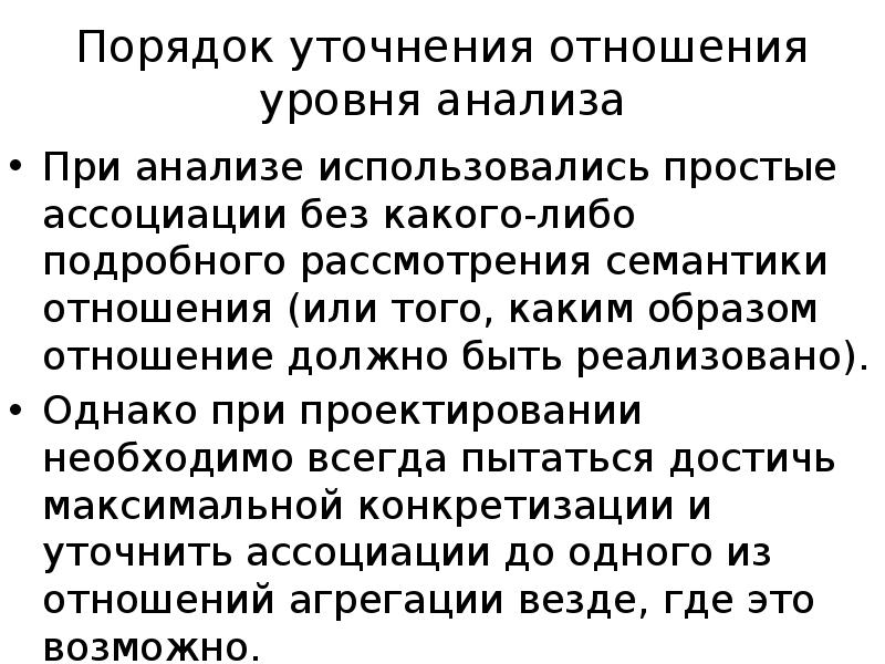 Порядок уточнения отношения уровня анализа При анализе использовались простые ассоциации без какого-либо подробного рассмотрения семантики отношения (или того, каким образом отношение должно быть реализовано). Однако при проектировании необходимо всегда пытаться достичь максимальной конкретизации и уточнить ассоциации до одного из отношений агрегации везде, где это возможно.