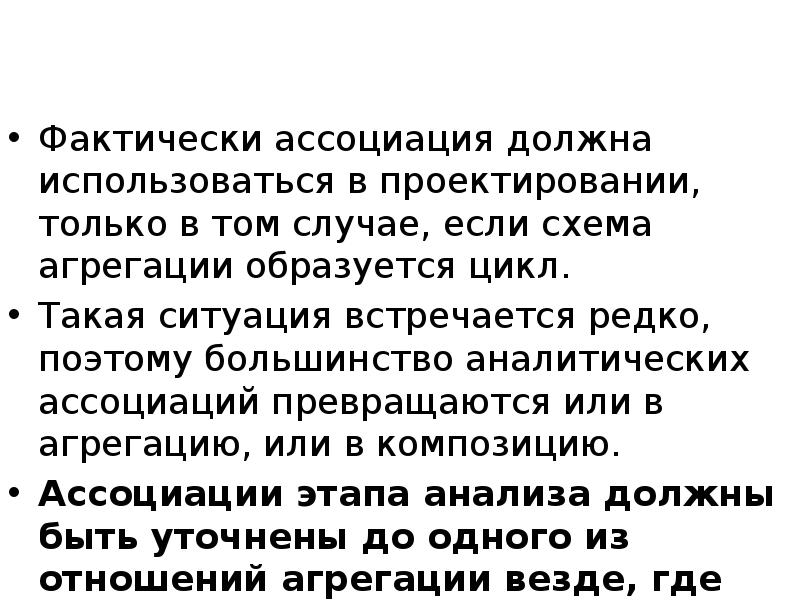 Фактически ассоциация должна использоваться в проектировании, только в том случае, если схема агрегации образуется цикл. Такая ситуация встречается редко, поэтому большинство аналитических ассоциаций превращаются или в агрегацию, или в композицию. Ассоциации этапа анализа должны быть уточнены до одного из отношений агрегации везде, где это возможно.