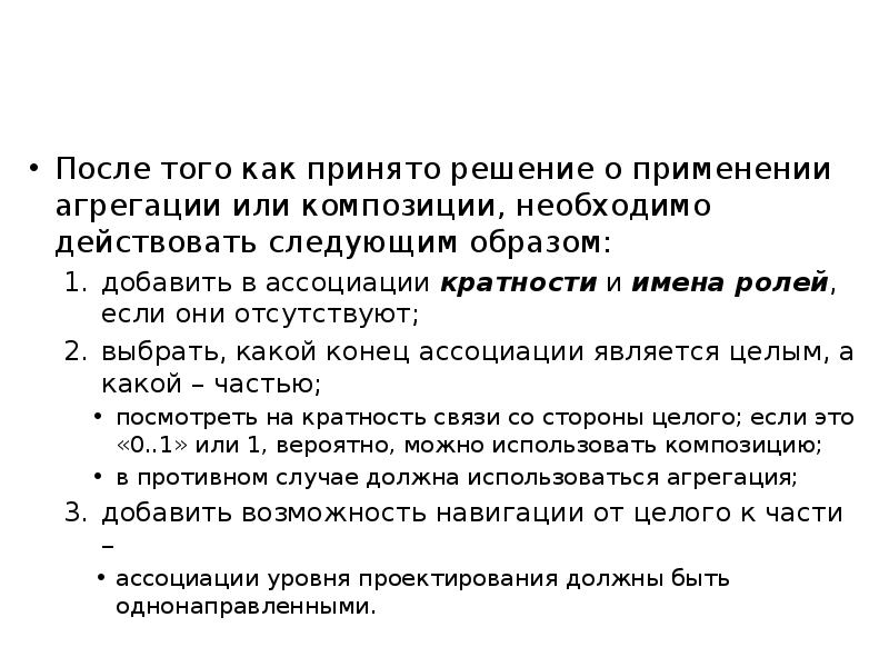 После того как принято решение о применении агрегации или композиции, необходимо действовать следующим образом: добавить в ассоциации кратности и имена ролей, если они отсутствуют; выбрать, какой конец ассоциации является целым, а какой – частью; посмотреть на кратность связи со стороны целого; если это «0..1» или 1, вероятно, можно использовать композицию; в противном случае должна использоваться агрегация; добавить возможность навигации от целого к части – ассоциации уровня проектирования должны быть однонаправленными.