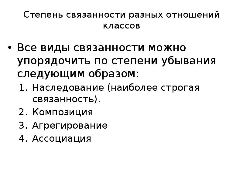 Степень связанности разных отношений классов Все виды связанности можно упорядочить по степени убывания следующим образом: Наследование (наиболее строгая связанность). Композиция Агрегирование Ассоциация