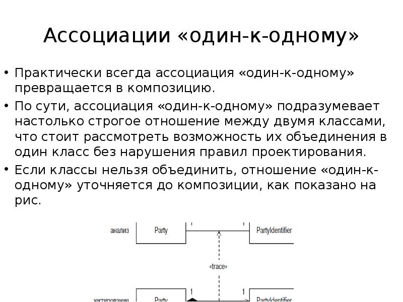 При анализе использовались простые ассоциации безФактически ассоциация должна использоваться в проектировании, только в том случае, еслиПосле того как принято решение о применении агрегации или композиции, необходимоАссоциации «один-к-одному»