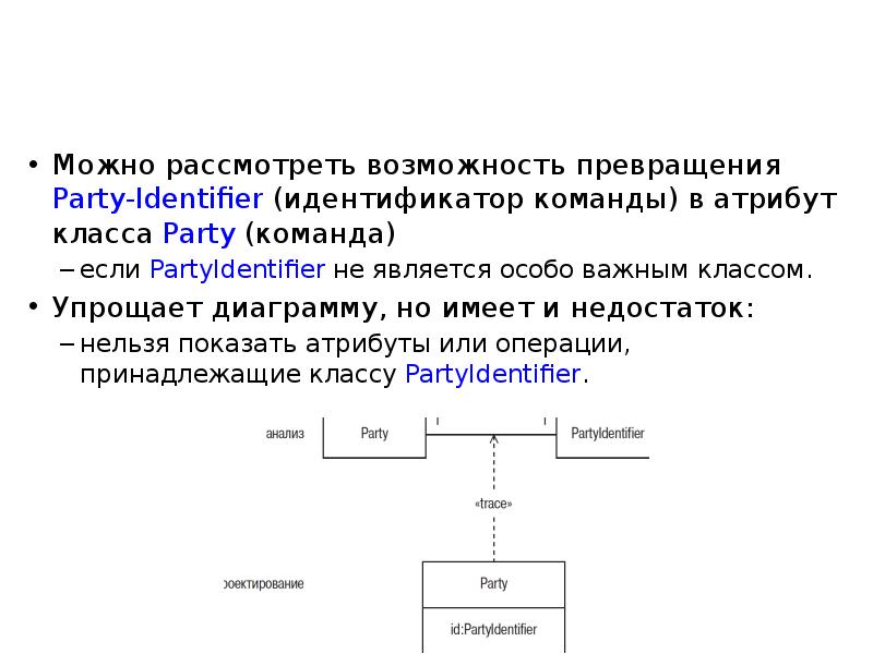 Можно рассмотреть возможность превращения Party-Identifier (идентификатор команды) в атрибут класса Party (команда) если PartyIdentifier не является особо важным классом. Упрощает диаграмму, но имеет и недостаток: нельзя показать атрибуты или операции, принадлежащие классу PartyIdentifier.